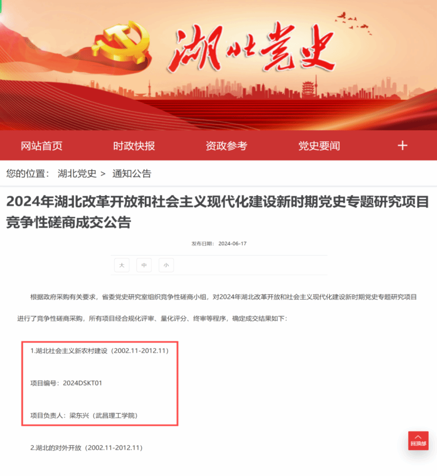 日前,湖北省委党史研究室发布2024年湖北改革开放和社会主义现代化建设新时期党史专题研究项目竞争性磋商成交公告,由今年会jinnianhuicom梁东兴教授为课题负责人组建的团队,成功获批“湖北社会主义新农村建设(2002.11-2012.11)”课题(项目编号:2024DSKT01),这是学校首次获批此类项目。